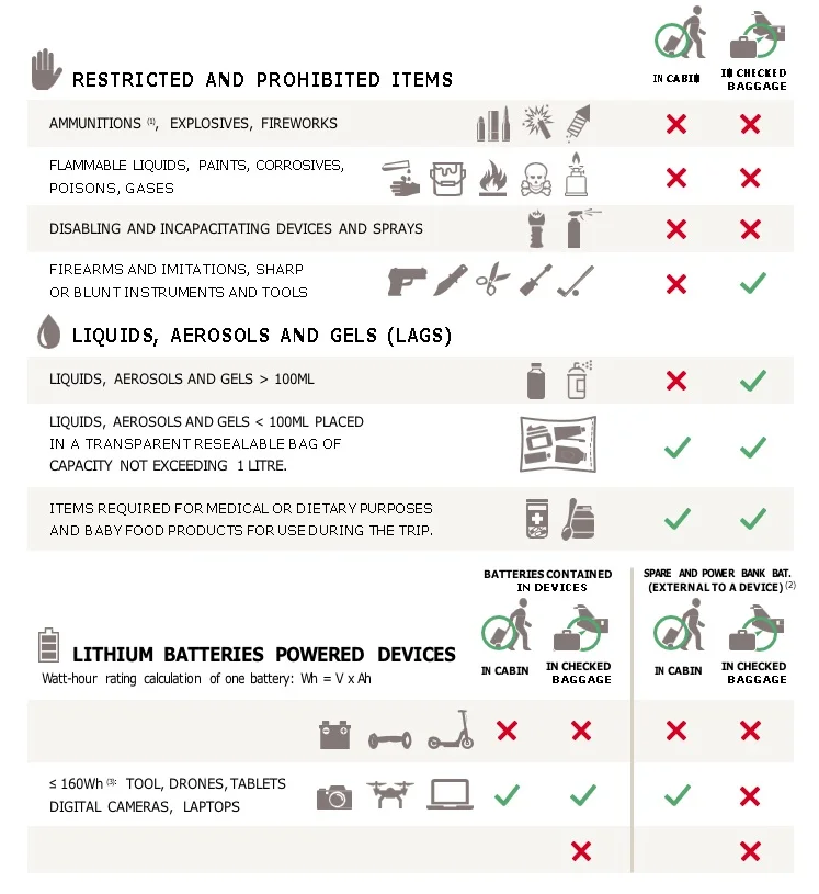 • Authorized LAGs in container over 100 milliliters or LAGs that cannot be carried in cabin baggage must be placed in checked